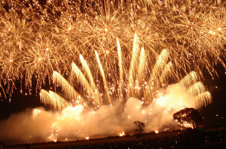 ドラゴンボールでよく星が消し飛ぶ時に、「カッ!!」ってページが見開きで白くなるじゃないですか。まさにあれ。視界がスパーキングして真っ白になった。爆発音もすごすぎて、もう何が起こったかわからん!花火見て「ギャアアア!!」って叫んだの初めてだよ。いや、普通そんな人いません。終わった後は会場大喝采!いやぁ、すごかった・・・。(涙)あの興奮は画像と説明じゃ伝わらない・・。伝えきれない・・・。あの5分間の芸術を見るためだったら¥2,000と高速代、ガソリン代なんてミジンコみたいなもんです。今まで生きてきた中で一番凄いものだったかもしれない。