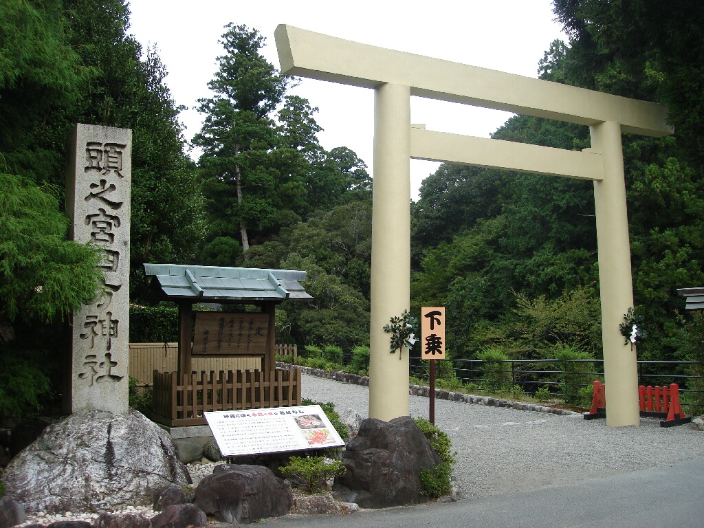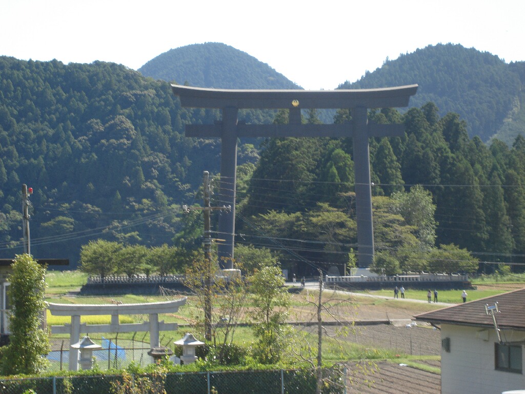 写真じゃ大きさの比較がイマイチだけど、とにかくデカイです。日本一の鳥居とのこと。どうやって建てたんだろ。もう、背景の山並みに大きい・・・。緑の山と田園風景の中に突如現れるんでかなりびっくりしますよ。鳥居の奥の森の中が、もともと本宮のあった場所だけど、今はもちろん何もなくて、言い方悪いけど空き地。ただ、聖地なので写真撮影は禁止になってたな。いや、何もないから写さないけどさ。