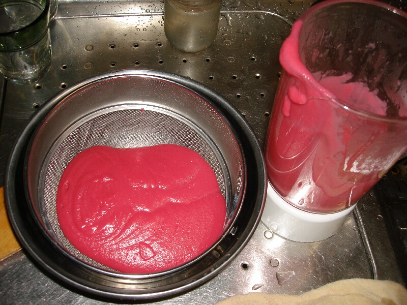 下の、ゴーストバスターズにでもでてきそうな気味の悪いピンクの液体は、ビーツとジャガイモ、玉ねぎを併せたペーストですが、これを牛乳で伸ばしていくと右のようなピンクのスープになります。
