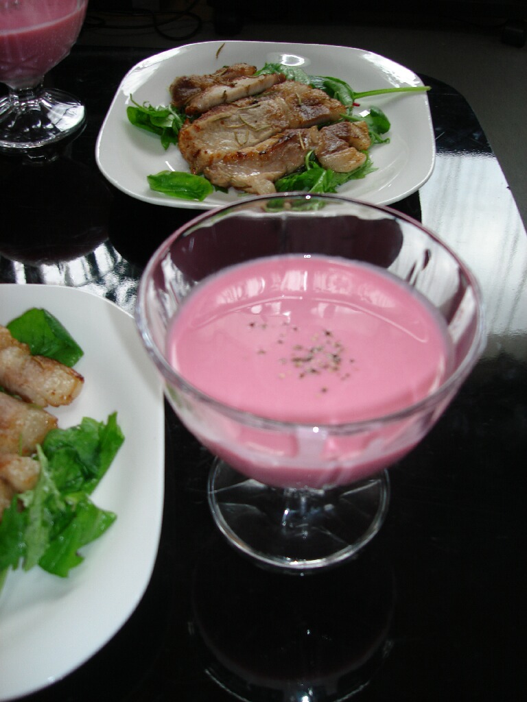 これ、ヴィシソワーズの改良型なんですけど、見た目がこんななんで女子に喜ばれるので(過程は別として)おもてなし料理として活用してるメニューです。何のスープかわからないってのが謎ときっぽくておもしろいし、温製でも冷製でもおいいしいってので喜ばれる。ただ、ビーツ缶がなかなか手に入らないので簡単には作れない料理かも。