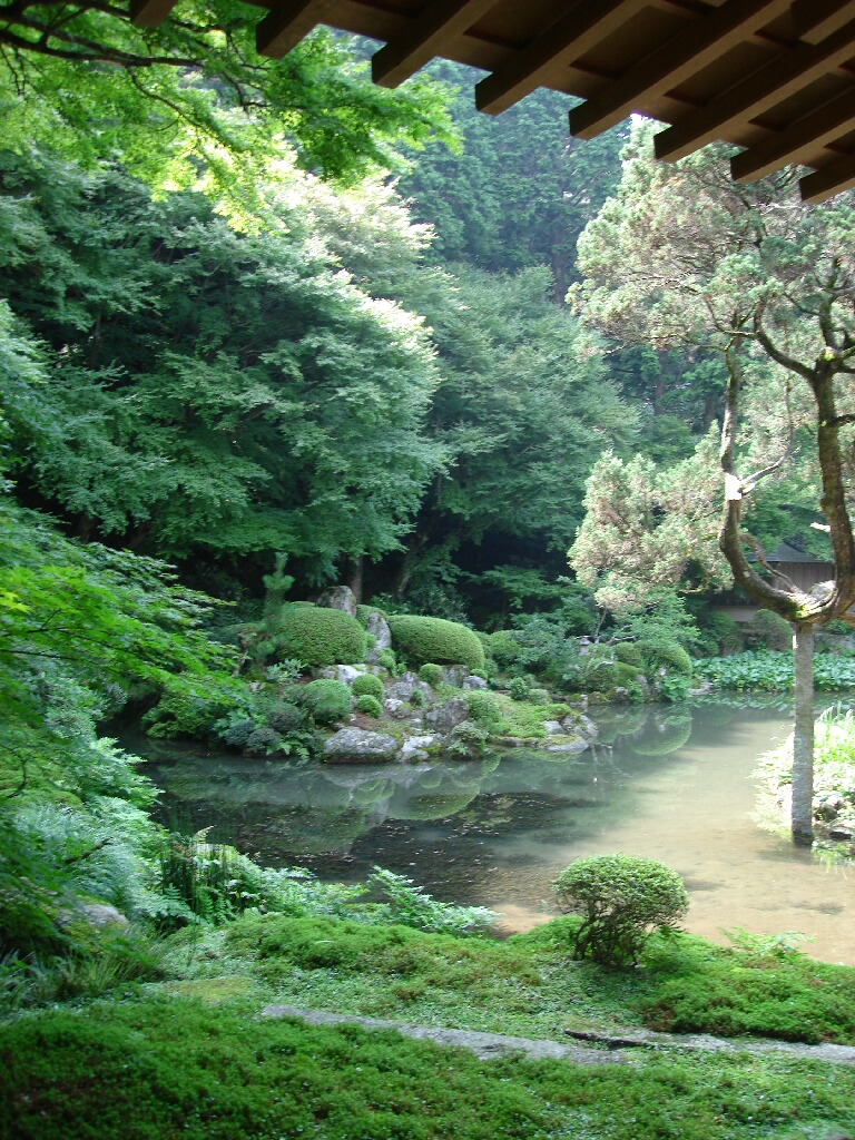 ここは紅葉の大楓が有名で私も過去に2回ほど来た事はあったけど、今回は堂内も拝観させてもらいました。山の斜面に沿って階段を登って行く時に見える庭園の眺めがすごい!苔と池の緑と奥の夏山の緑が重なって綺麗~。お寺の庭園っていうのは、仏の住む世界を表した空間で、見る人に仏の教えを説くのだそうな。だから、みんな庭園を見ながらボーっとしてるんだな。というかこの空間に来ると理屈抜きで無心になるんだろうなー。空気が違うもんな。庭ってすごい。