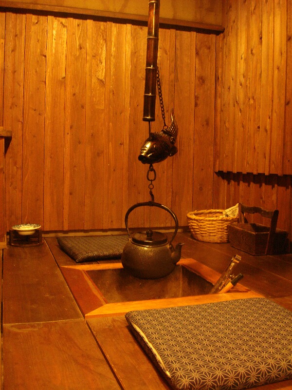 6畳の和室なんですが、なぜか一段高くなったとこにちゃぶ台(?)があってその横の扉を開けると洗面所とトイレになってます。そして隠し扉的な扉を開けるとそこに囲炉裏端が!