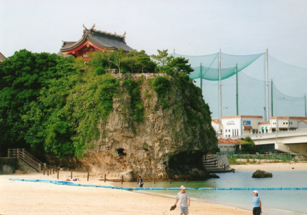 境内への階段を上らずに右手降りて行くと、那覇市で唯一のビーチ、波の上ビーチに出ますが、ここ、目の前に道路が走っていたりコンテナが山積みになってたりで景観は相当悪い。なんか年々悪くなってるような気が・・。海は沖縄なだけあってきれいだけど、ここで泳ぐ気にはなれんな~・・。遊泳区間狭いし。周りが公園になってるから犬の散歩にはいいかも。実際犬が泳いでた(笑)