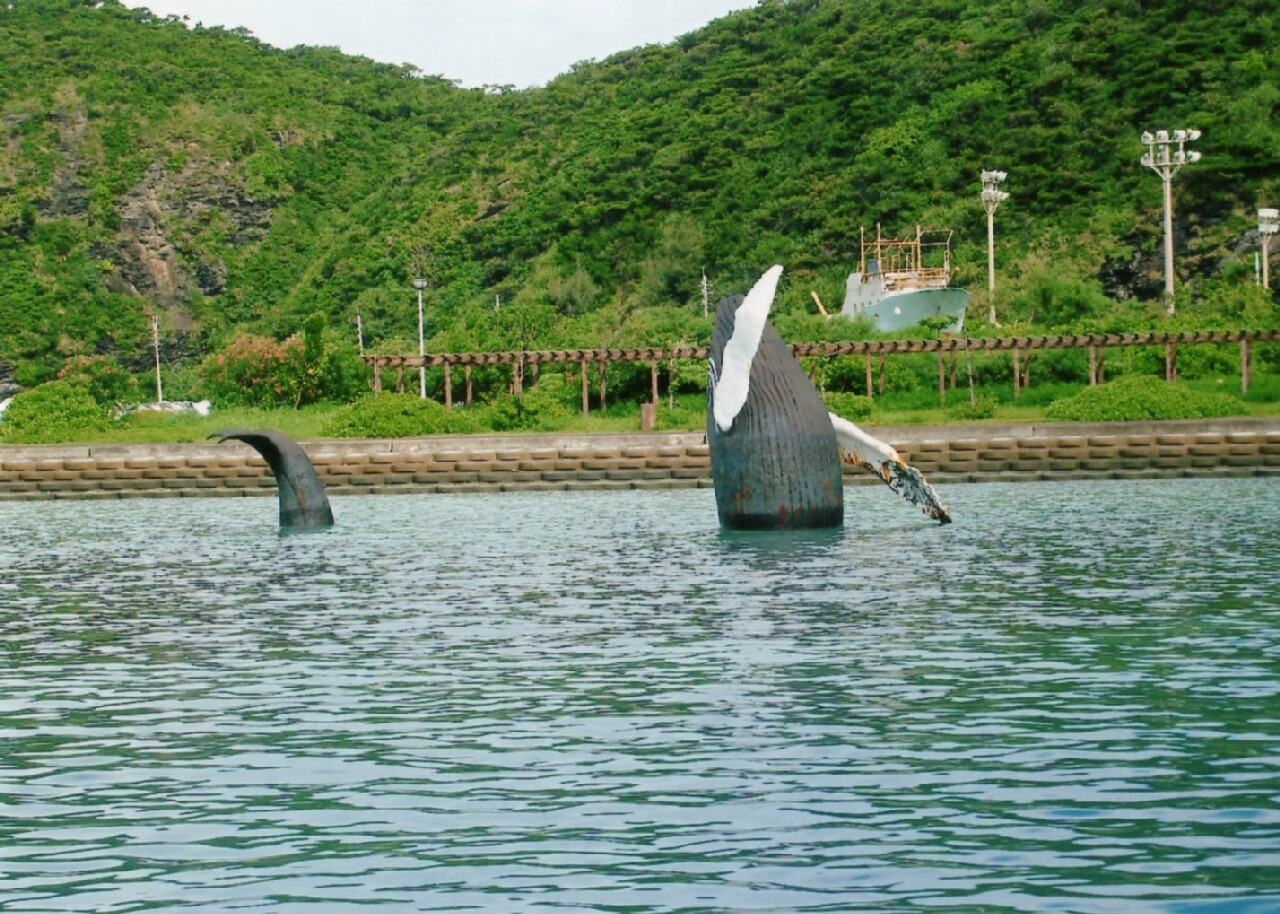 湾内にはあちこちに鯨のモニュメントがありました。ちょっと分かりづらいけど右画像、ザトウクジラかな?ヒレのとこがさびついてて痛々しい(笑)