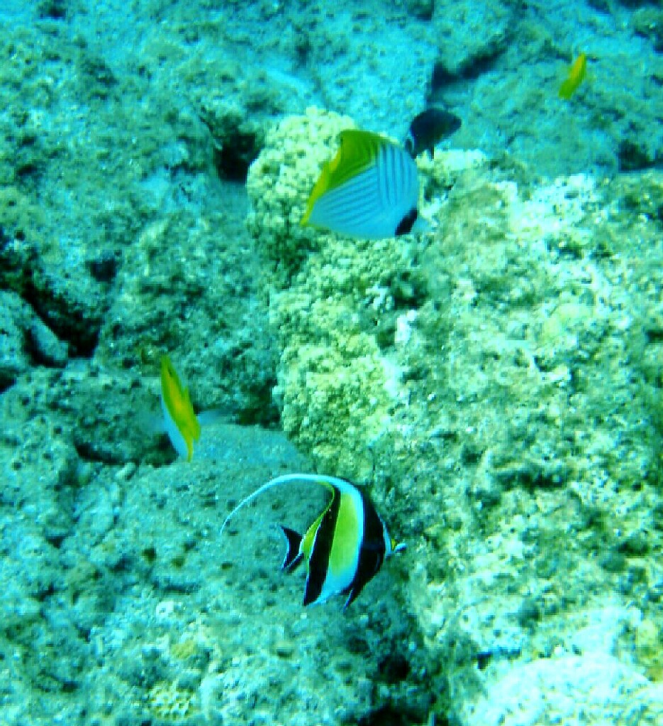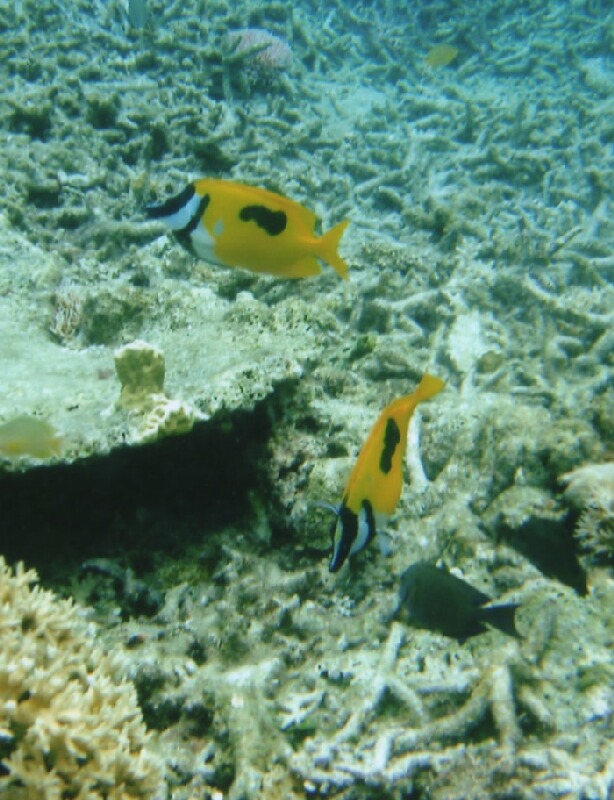 海中はもちろんお魚さん達の楽園。浜からエントリーする時にすでに足元にチョウチョウウオが泳いでいて、ここでも警戒心ゼロ!前日のクマノミちゃん達ほどたかりには来ないけど人慣れしてるな~。ここじゃ人間に悪さされることもないから警戒しないんだろうな。みんなのびのびしてる。
