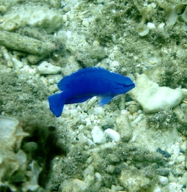 本島の真栄田岬で潜った時も結構魚がいて感動したけど、ここはもっと色んなサイケな色の熱帯魚がわんさかいて楽しい!水面近くには小魚(スクガラス?)の群れが泳いでて、底の方ではブダイやらスズメダイやらが忙しそうにしてる。 水中なんで必死こいてシャッター押しまくってたら、
