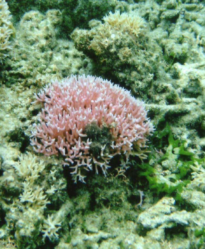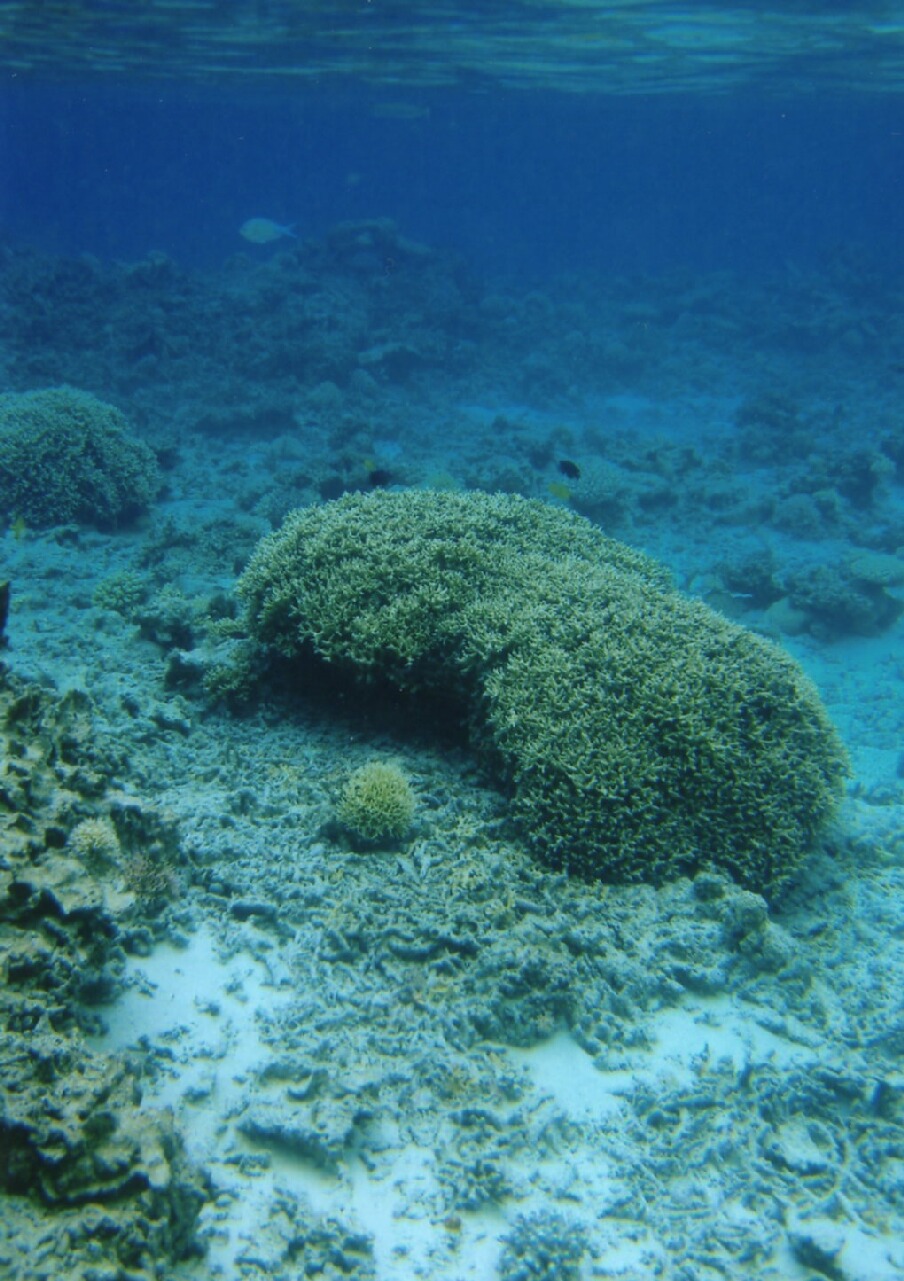 古座間味に比べるとここはサンゴも色んな種類があってどれも元気そう。中には2メートルはありそうなテーブルサンゴもあって、その周りには小さな熱帯魚がわんさかいる。先月産卵がニュースになっていたミドリイシサンゴもたくさんあった。ただ、底の方には白くなった、要するに死んでしまったサンゴもあって切なくなった。